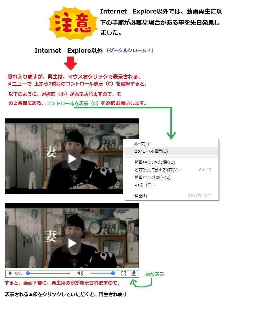 ブラウザにインターネットエクスプローラー以外をご使用の場合は、マウスを右クリックして表示される、コントロール表示→再生(動画に表示される三角印が変わります!)を選択してください。